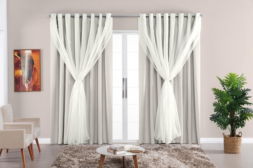Conteúdo da embalagem: Cortina dividida em duas partes iguais (Varão não incluso) Ilhós: Desliza facilmente sobre o varão Possui ilhós de 28mm CROMADO Não oxida Não enferruja Sobre o produto: Sombreamento total de 90% Produto para varão simples Tecido superior em Voal 100% Poliéster Tecido Inferior em blackout 90% Poliéster Enviado em embalagem própria e segura para cortinas Acabamento feito na bainha Garantia do vendedor: 7 dias