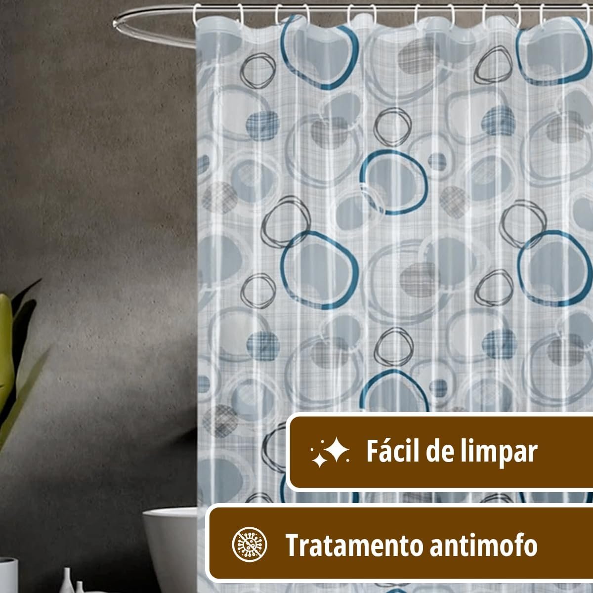 COM TRATAMENTO ANTIMOFO E RESISTENTE VANTAGENS – Possui aditivo antimofo em sua composição – Impermeável e Resistente – Seca Rápido – Flexível e com ótimo caimento – Fácil de limpar, bastar lavar com esponja macia e sabão neutro – Acompanha argolas para fixação Esse modelo de cortina é usado para a proteção no box do banheiro, tem ótimo caimento e evita que água se espalhe por todo o ambiente durante o banho. Suas funcionalidades são capazes de atender as necessidades dos clientes de uma forma bastante interessante, fazendo com que possa ser aproveitada em diversas situações. CONTÉM: 1 cortina(s) Acompanha argolas para fixação. NÃO ACOMPANHA VARÃO DE SUSTENTAÇÃO DIMENSÕES: Largura: 1,80m | Altura: 1,80m MATERIAL: 100% Polietileno Um Produto Idealiza Comercio de Utilidades.
