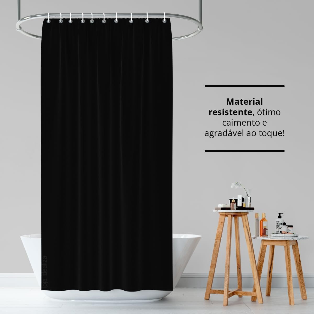 Cortina de material 100% PVC grosso, flexível, impermeável e fácil de limpar.