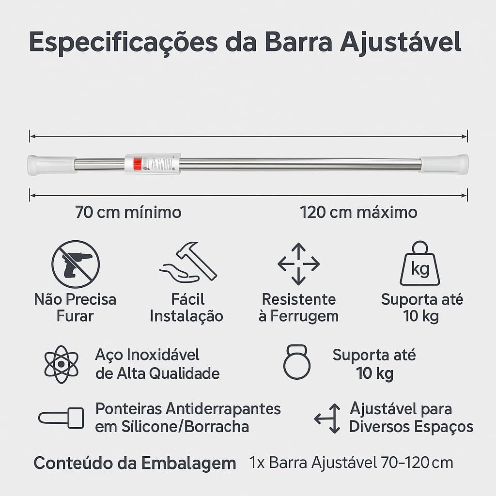 👍Ajuste Perfeito para Seu Espaço: Mecanismo telescópico adapta a barra ajustável de 70cm a 120cm. Ideal para qualquer box de banheiro ou banheira.