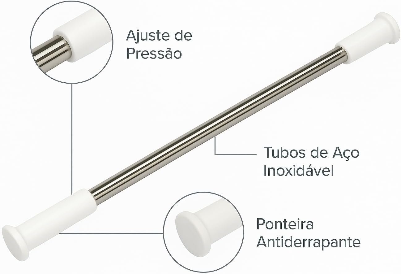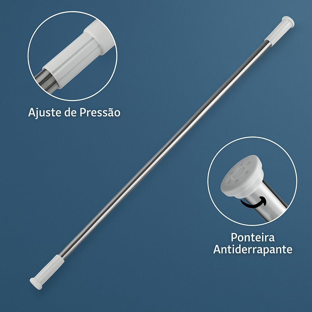 p>Barra de Tensão Telescópica Ajustável 70–120 cm – Cromado/BrancoInstale cortinas e divisórias sem furar a parede. A barra ajustável funciona por pressão: basta estender até o tamanho desejado e girar para travar. Ideal para janelas, box com cortina, lavanderia, cozinha, closet e onde você precisa de uma solução prática e temporária.