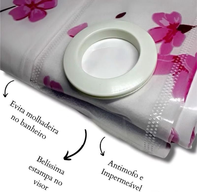 na barra de cortina. Impermeável: Impede que a água respingue no banheiro. Prático: Não precisa passar a ferro, seca rapidamente.