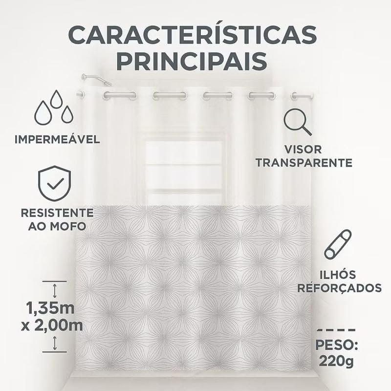 Características do Produto Material Durável: Feito de 100% vinil, durável e fácil de limpar. Ilhós Reforçados: Feitos de polipropileno para maior durabilidade e resistência a rasgos. Cortina Transparente: Garante ampla entrada de luz no chuveiro, protegendo