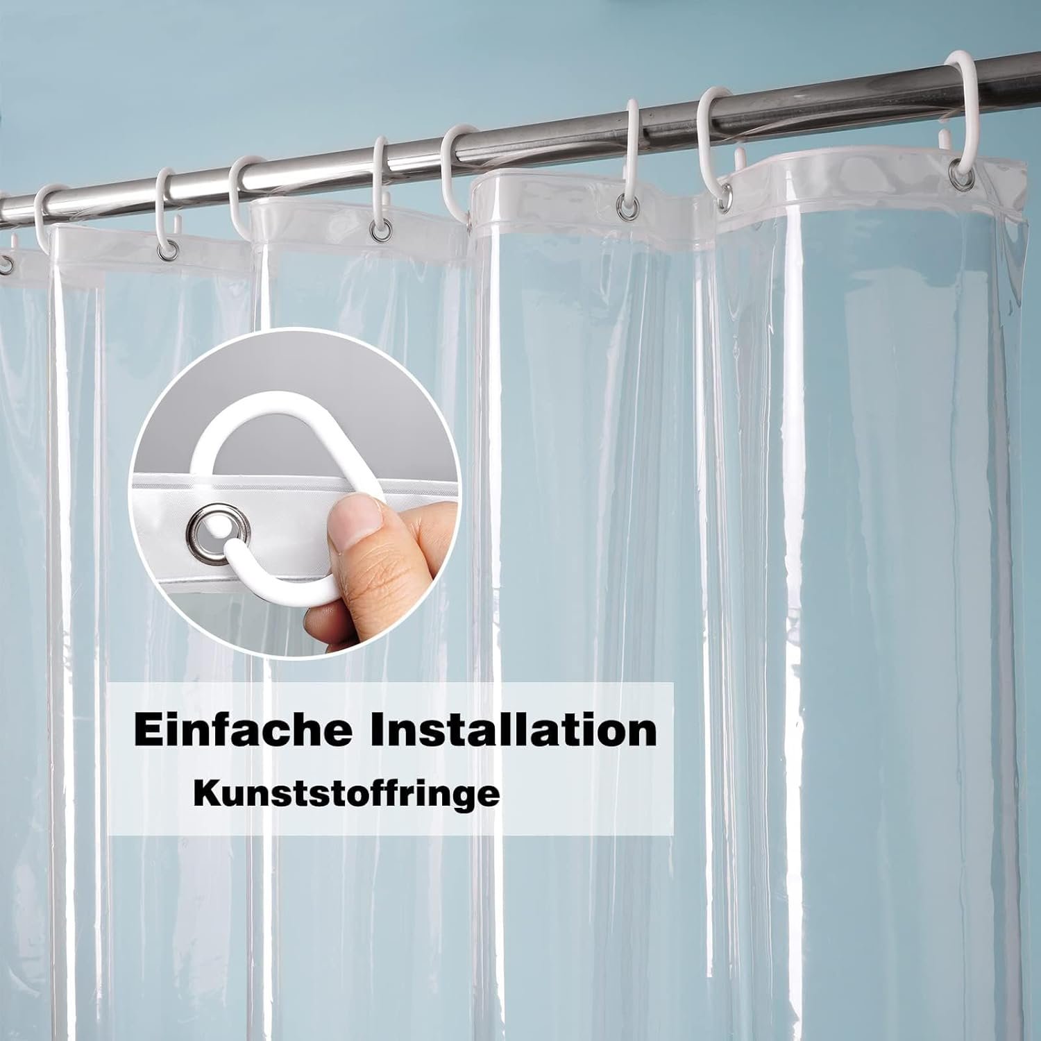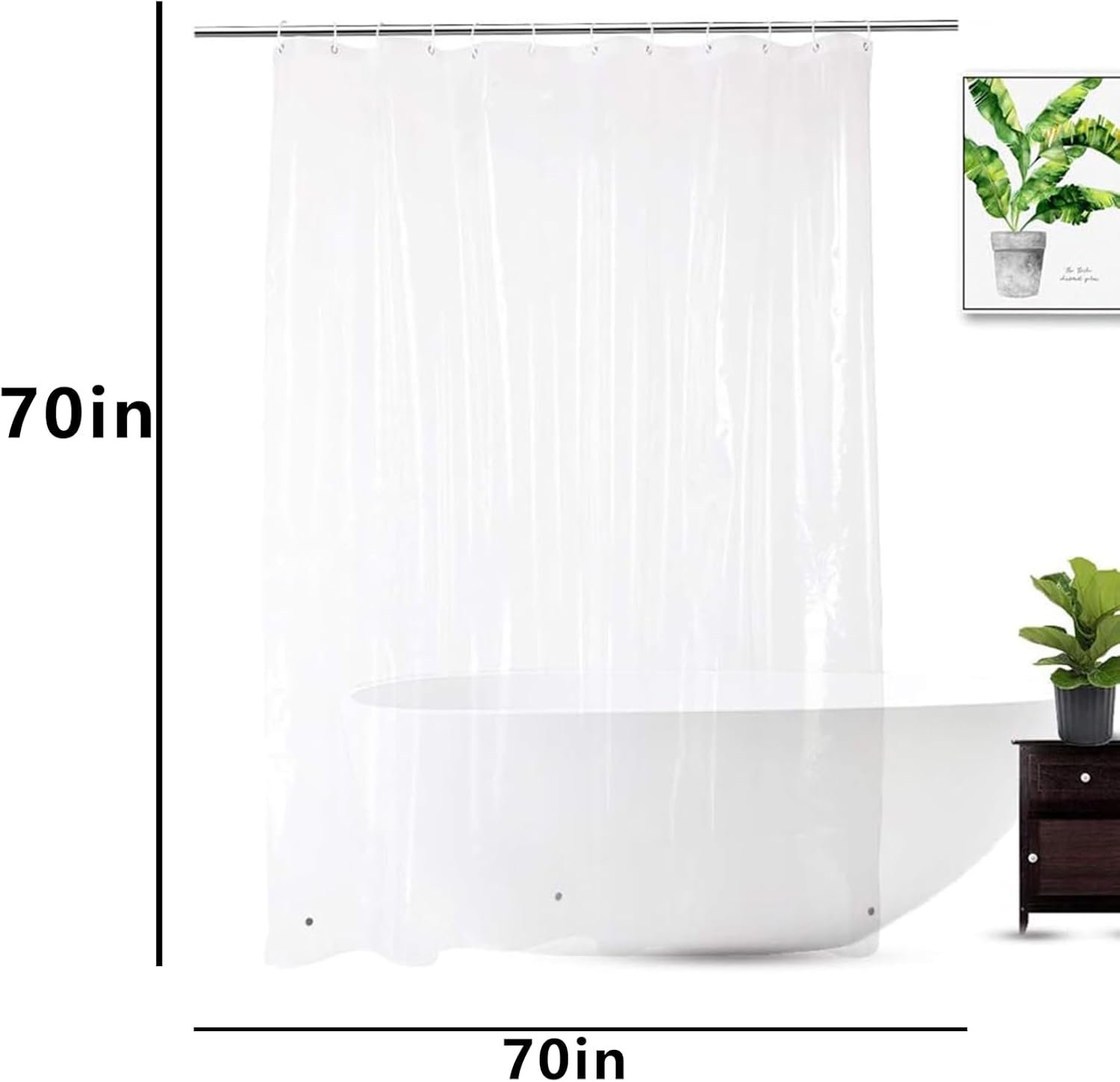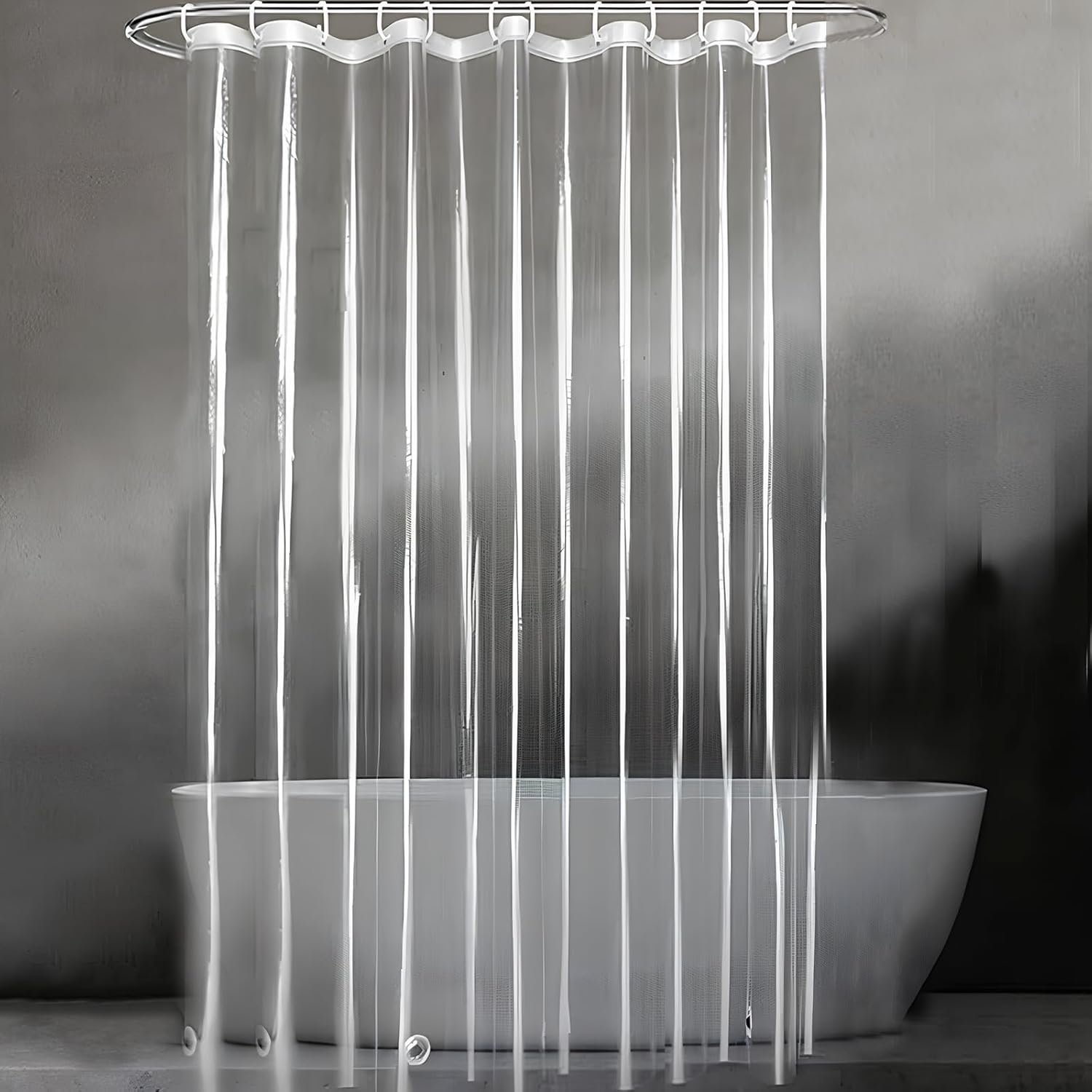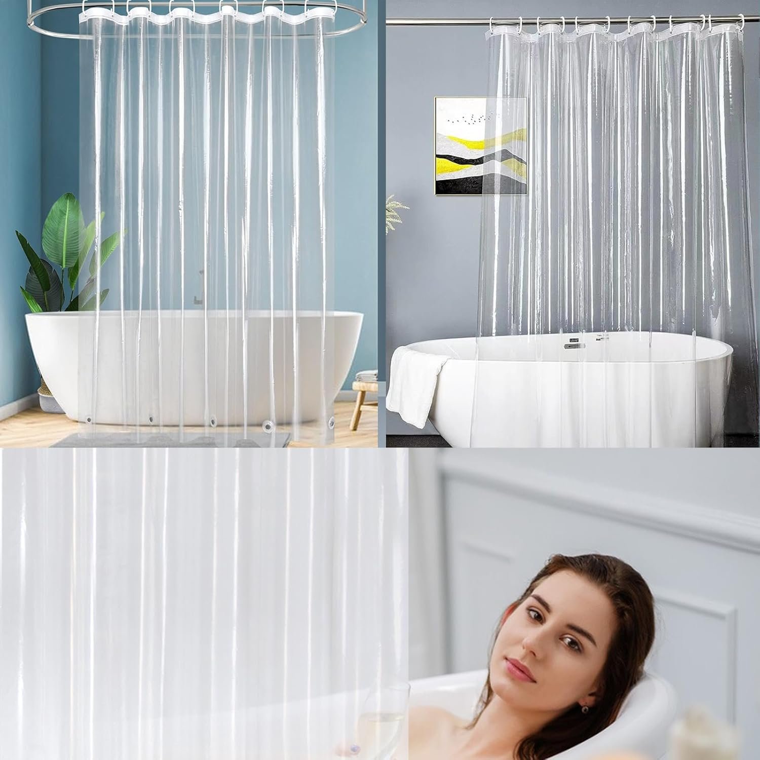 Cortina de chuveiro transparente: o design transparente permite que a luz flua, mantendo os banheiros abertos; adequado para banheiras ou barracas em casas, apartamentos, hotéis ou dormitórios; fácil instalação com orifícios reforçados que suportam a maioria dos ganchos ou anéis padrão.