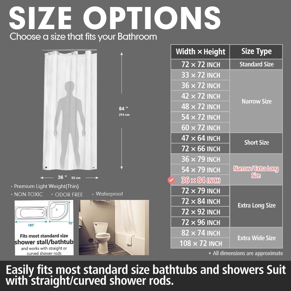 (APENAS PARA BANHEIRO PEQUENO) – Este é um forro de chuveiro de tamanho estreito de 91 cm x 213 cm. Cabe apenas em banheiros pequenos. Adequado com hastes de chuveiro retas/curvas. Esta cortina pode ser usada junto ou como forro para uma cortina de chuveiro de tecido. Não se preocupe mais em ajustá-la à sua cortina de chuveiro de tecido favorita. Se você tiver sua cortina de chuveiro de tecido favorita, este forro deve ser sua melhor opção para escolher.