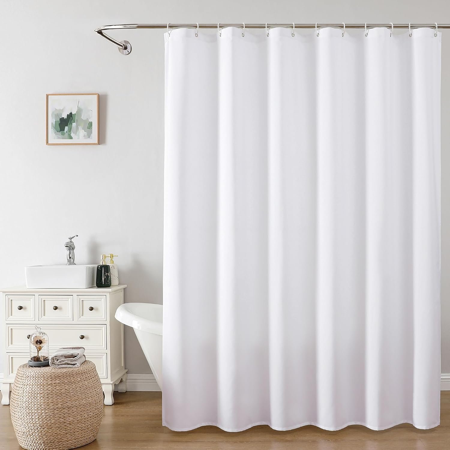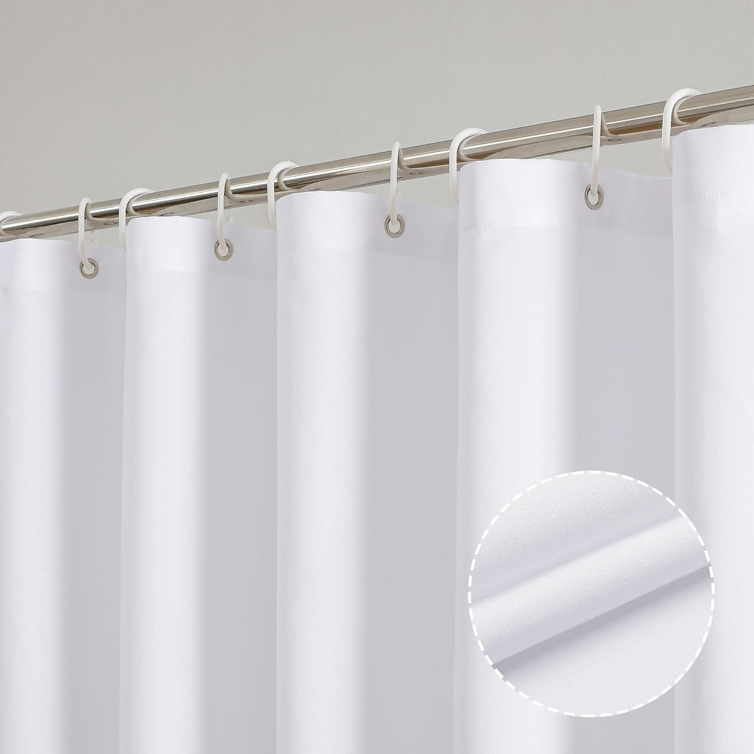 Cortina de chuveiro branca: 183 cm x 183 cm. 12 argolas de metal à prova de ferrugem que se encaixam na maioria dos ganchos ou anéis de chuveiro padrão. O pacote inclui 1 cortina de chuveiro branca e 12 ganchos de plástico (conveniente de instalar).