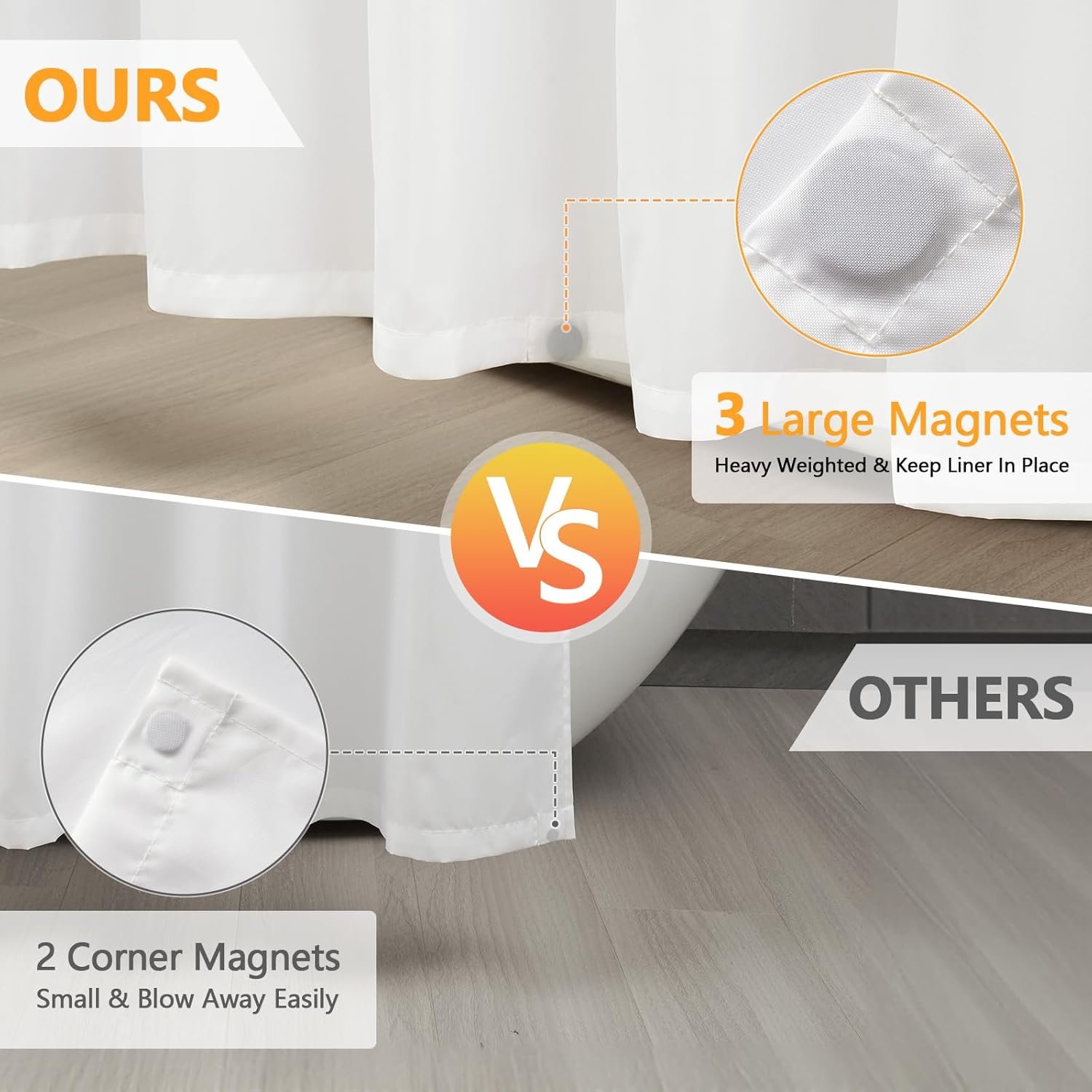 【Bainha magnética ponderada】Possui 3 ímãs pesados na parte inferior, que podem pesar a cortina e assim permitir que ela pendure melhor, mantendo o forro no lugar e evitando que ela se enrole. Esta cortina de chuveiro branca opaca pode ser usada como cortina de chuveiro independente ou como forro de chuveiro para proteger a cortina externa de sujeira e umidade.