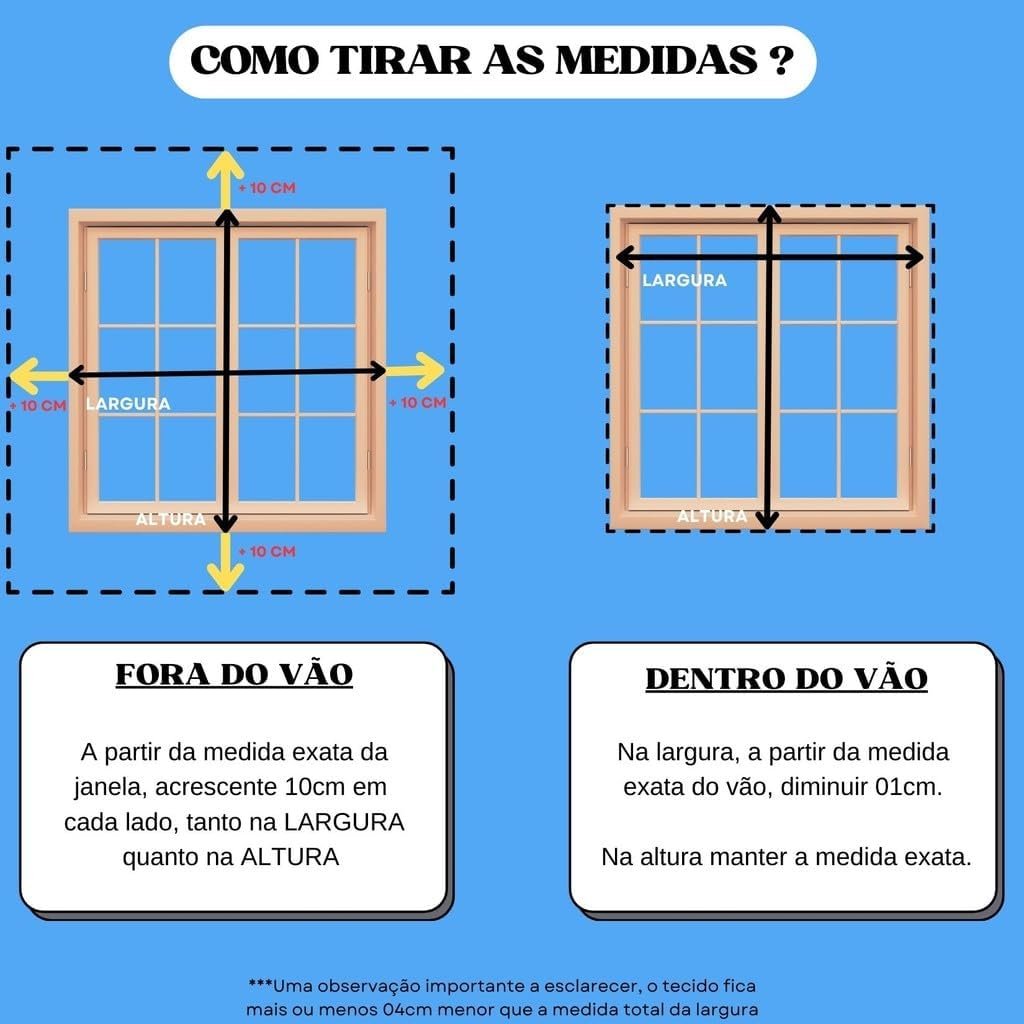 Para instalação dentro da moldura da janela, as dimensões da sua janela devem ser 1,00 m x 1,20 m.
