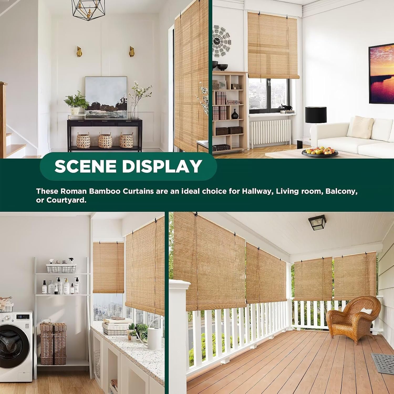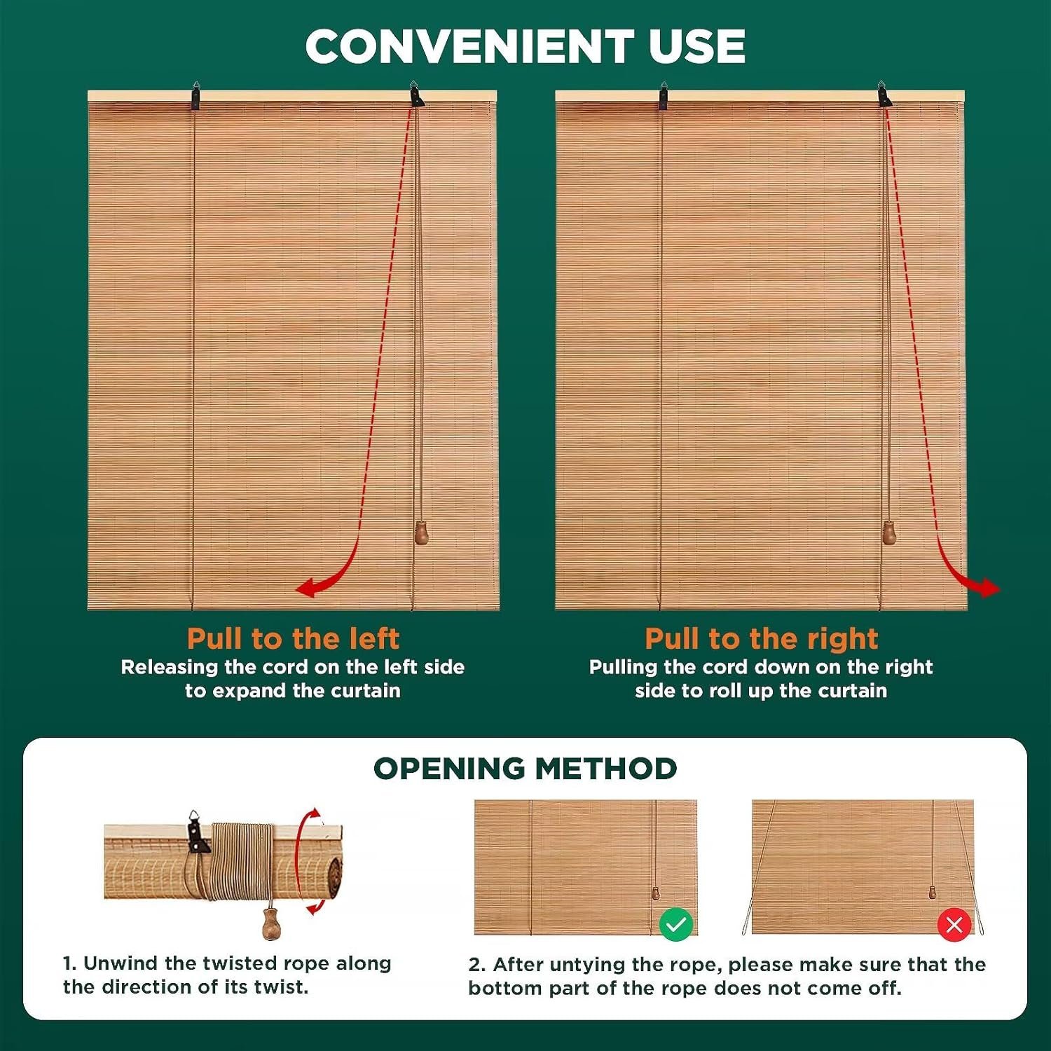 Coberturas de janela versáteis para todos os cômodos: nossas persianas de enrolar de bambu não são apenas funcionais, mas também servem como decoração elegante. Elas combinam perfeitamente com vários estilos de design, do moderno ao tradicional, tornando-as uma escolha versátil para qualquer cômodo. Se você estiver atualizando sua sala de estar, quarto ou cozinha, essas persianas adicionam uma elegância natural e rústica ao seu espaço. Seu design leve e fácil operação as tornam uma adição prática e estética à sua casa.