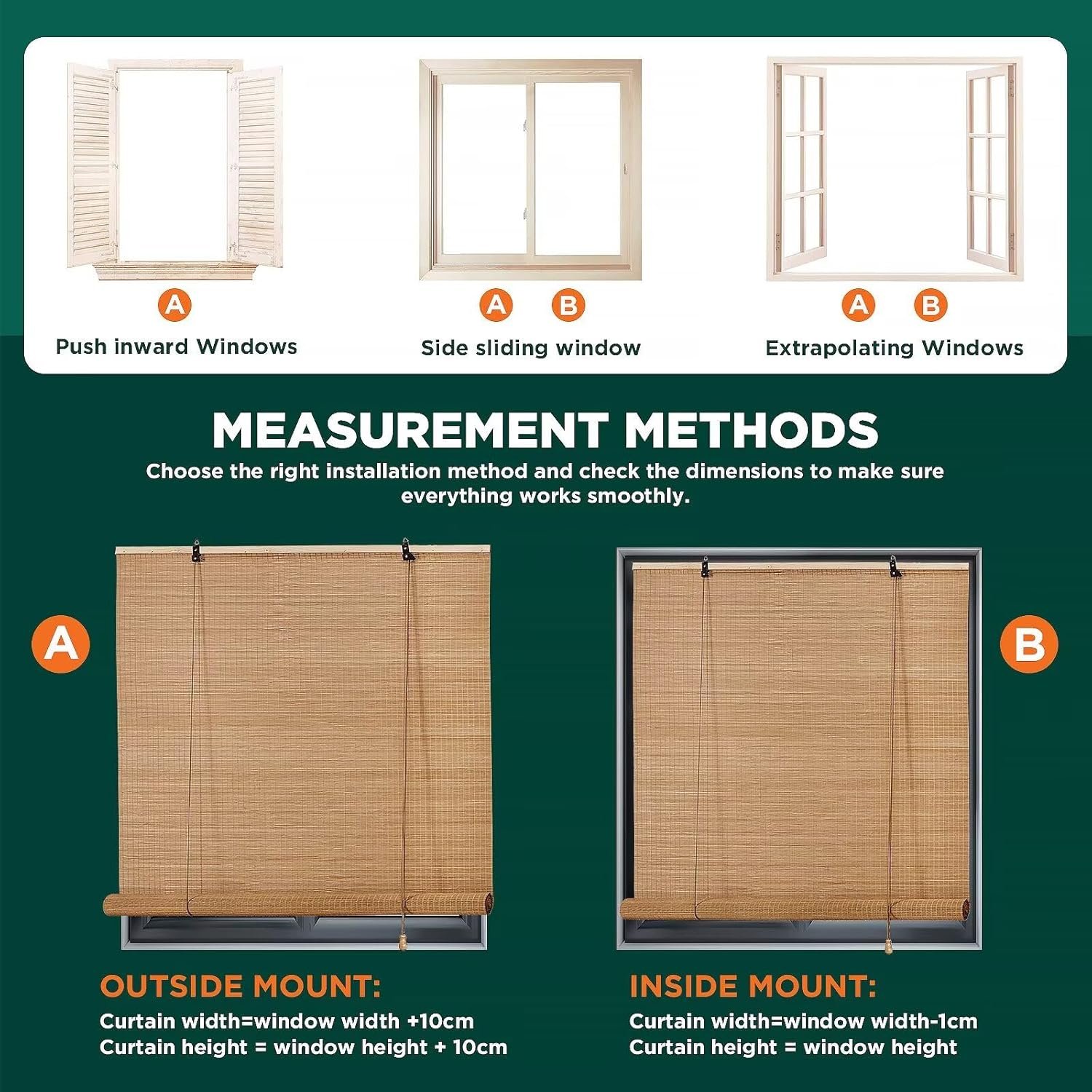 Opções personalizáveis e serviço excepcional: se nossos tamanhos padrão não se ajustarem às suas janelas, oferecemos persianas de bambu personalizadas sob medida para suas dimensões específicas. Estamos comprometidos em fornecer produtos de alta qualidade e atendimento ao cliente excepcional. Nossa equipe está sempre pronta para ajudar com qualquer dúvida ou preocupação, garantindo sua total satisfação. Escolha nossas persianas de bambu para uma solução de cobertura de janela sustentável, elegante e sem complicações que atenda às suas necessidades.